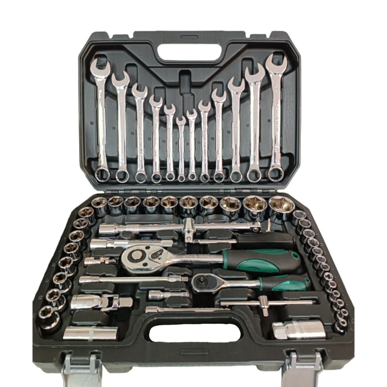 Набор профессиональных инструментов для ремота авто состоит из 61 предмета в прочном противоударном кейсе и включает в себя практически всё, что необходимо для большинства ремонтных работ - как в гараже обычного автолюбителя, так и в боксе специализированного сервиса. В представленный набор инструментов 61 входят два вида держателей с трещотками, несколько переходников и карданов, множество типоразмеров торцевых насадок и бит, а также максимально полезный в работе комплект из 12 комбинированных рожково-накидных ключей. За счет высокого качества и прочности всех составляющих комплекта, для производства которого применяются особые марки высоколегированных сталей, данный набор инструментов отлично подходит для работы в автосервисе. Посадочный квадрат трещоток с реверсом и быстрым сбросом 1/4" и 3/8".
