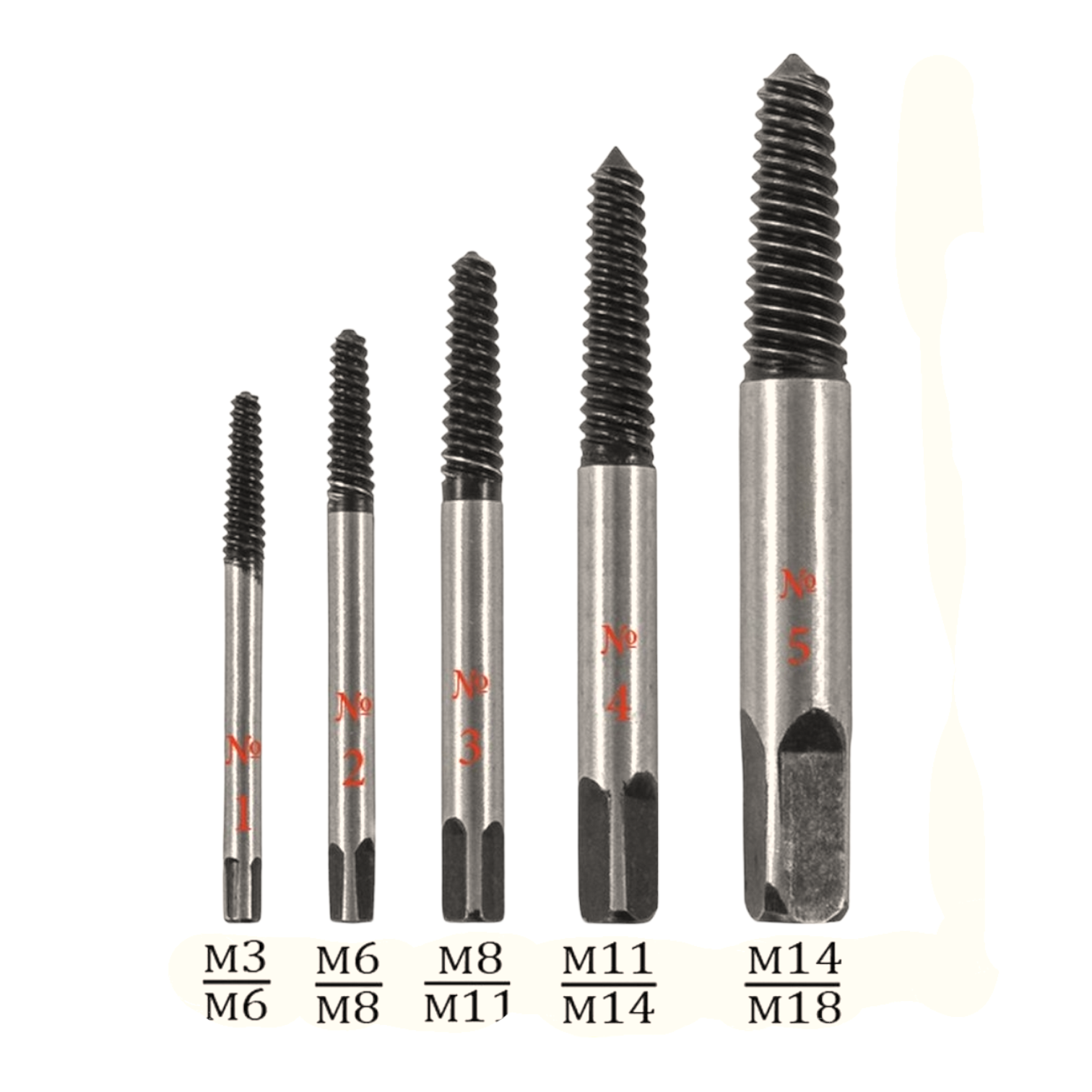 Экстрактор болтов или «вывертка» — слесарный инструмент которым без особого усилия можно удалить болты, винты и саморезы со сломанными головками или разбитыми шлицами. Принцип работы простой: экстрактор закручивается путем вращения по часовой стрелке, погружаясь в материал, извлекает поврежденный крепежный элемент. Экстракторы подбираются по размеру, в соответствии с величиной поврежденного крепежа. Набор из 5 экстракторов изготовлен из хром-молибденовой стали и поставляется в удобном кейсе для хранения. Экстракторы имеют прецизионный конический наконечник и подходят для резьбы поврежденных винтов M3-M18. Длина экстракторов в мм: 51, 58, 65, 75, 80. Диаметр: 2.5, 3, 4, 5, 6.5.